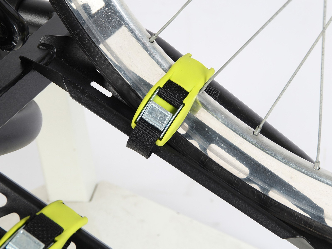 Die Trio-Plattform ist mit einem speziell entwickelten Conical-System- Mechanismus ausgestattet, der aus vier glockenförmigen Elementen besteht und für die sichere Befestigung der Anhängerkupplung sorgt. Nachdem Sie den M10-Knopf festgezogen haben, ziehen Sie den Träger mit dem mitgelieferten Schraubenschlüssel fest. Die Plattform passt auf jeden europäischen Standard-Anhängerkupplungskopf, und das Design des Fahrradträgers ermöglicht es, den Träger mit wenigen Handgriffen zusammenzuklappen, was den Transport und die Lagerung erheblich erleichtert. Die Installation der Inter Pack Trio-Plattform ist einfach , intuitiv und erfordert kein zusätzliches Werkzeug; alles, was Sie brauchen, ist im Lieferumfang enthalten. Das Set enthält auch Gurte zur Befestigung von Rahmen und Rädern. Die maximale Reifenbreite, die durch die Dachrinne passt, beträgt 2,35 Zoll .
