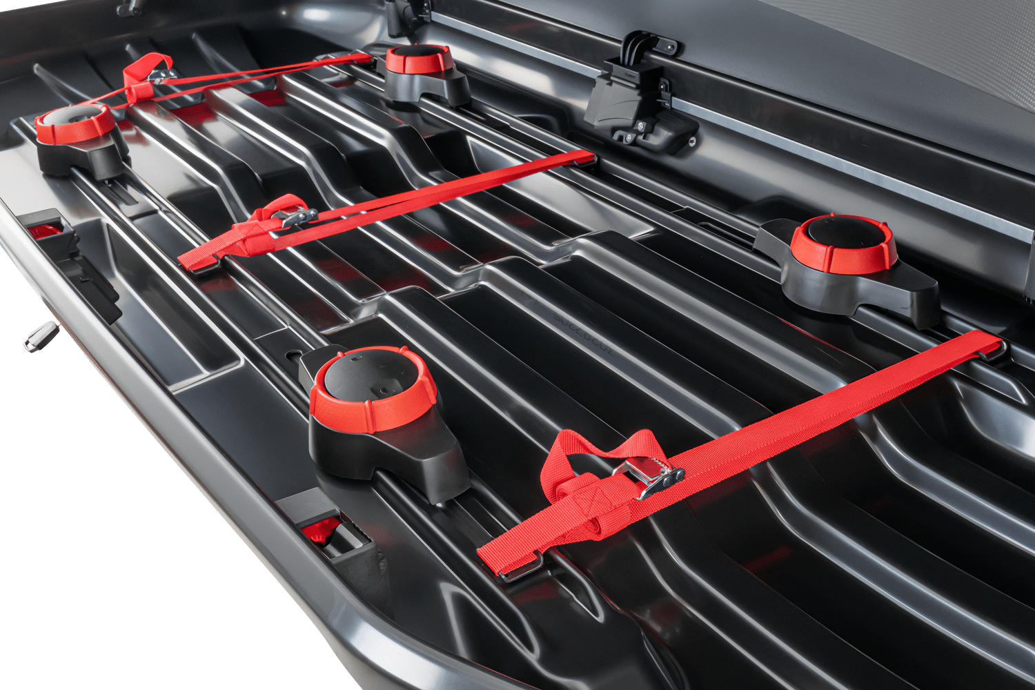 Im Set sind außerdem Textilbänder enthalten. zur Sicherung des Gepäcks (die Casar-Box verfügt über spezielle Stellen zum Anbringen von Gurten).