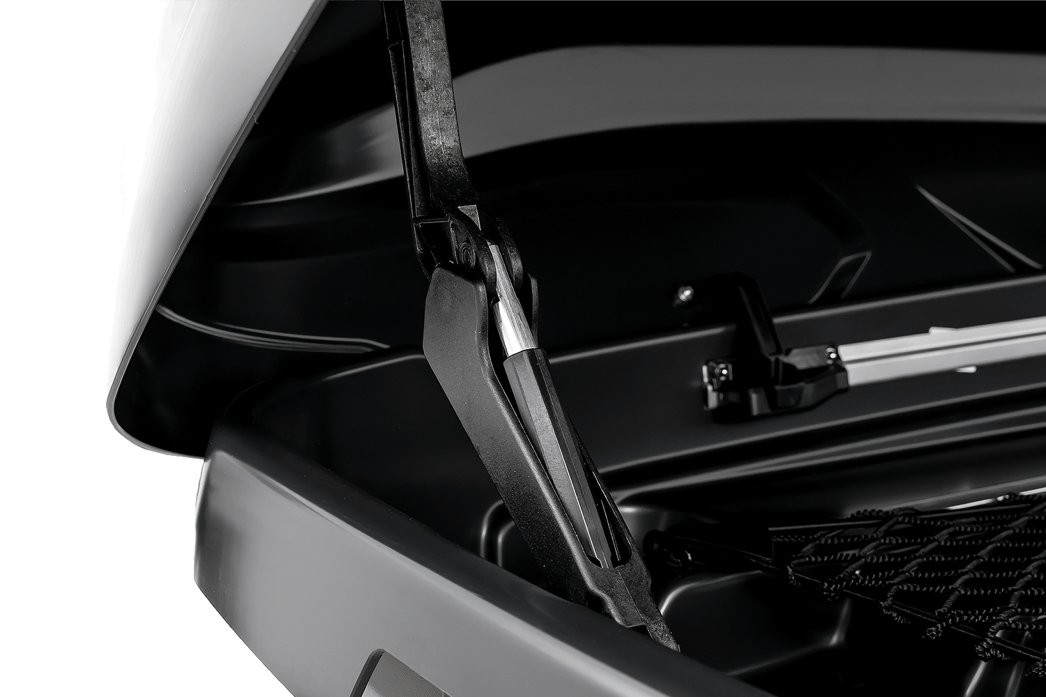 Dieses Modell besticht durch sein modernes Design und die robuste Konstruktion aus UV- und witterungsbeständigem ABS- Kunststoff . Es wiegt lediglich 16 kg und bietet eine maximale Tragfähigkeit von 75 kg . Der untere Teil der Box wurde speziell profiliert und zusätzlich mit zwei Metallstreifen verstärkt, um die Stabilität zu erhöhen. Das beidseitige Öffnungssystem vereinfacht das Beladen und den Zugriff auf die Box erheblich, unabhängig von der Fahrzeugseite. Ein zentrales Dreipunktverriegelungssystem garantiert ein hohes Maß an Sicherheit für transportierte Gegenstände. Eine zusätzliche Sicherheitsmaßnahme ist das eingebaute System, das das Abziehen des Schlüssels aus dem Schloss nur bei ordnungsgemäß geschlossenem Deckel ermöglicht.