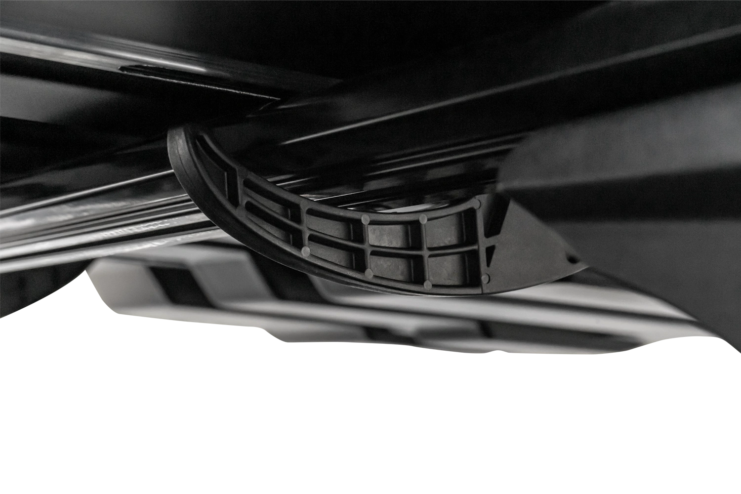 Das Montagesystem ist auf beweglichen Schienen montiert und ermöglicht die Anpassung an den Querträgerabstand des Dachträgers , der zwischen 46 cm und 115 cm liegen muss. Rapid Fit verfügt außerdem über einen Dynamometer , der signalisiert, wann die Box richtig befestigt ist und das Risiko einer Beschädigung des Grundträgers oder der Dachbox minimiert .