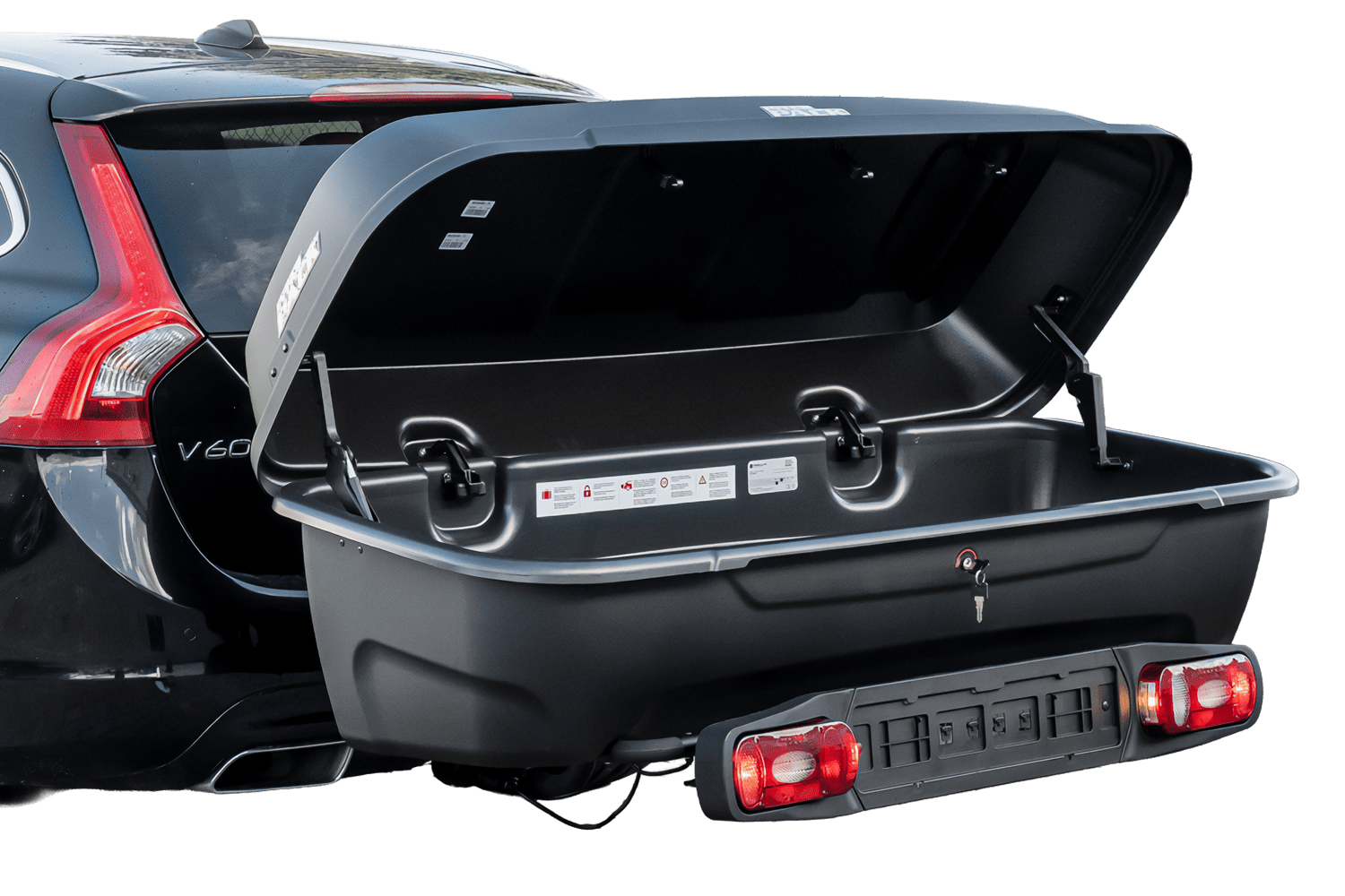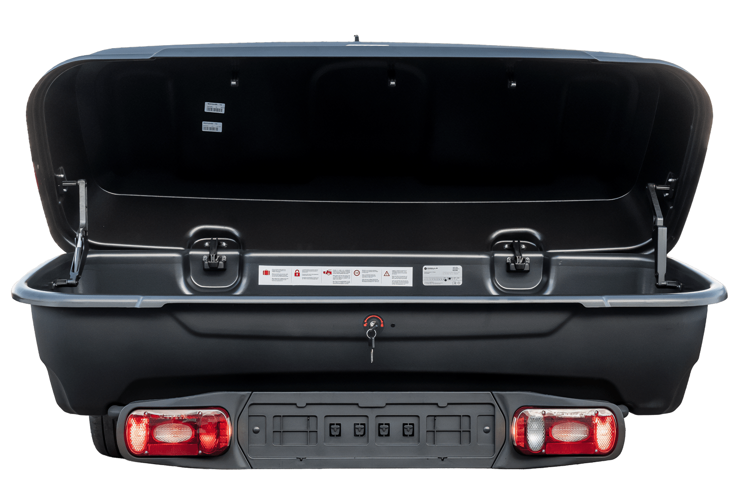 Die Box wird mit einem Haken über stabile U-Bolzen an der Plattform befestigt und mit einem Dreipunktverschluss gesichert. Leistungsstarke Antriebe ermöglichen ein einfaches Anheben des Boxdeckels.