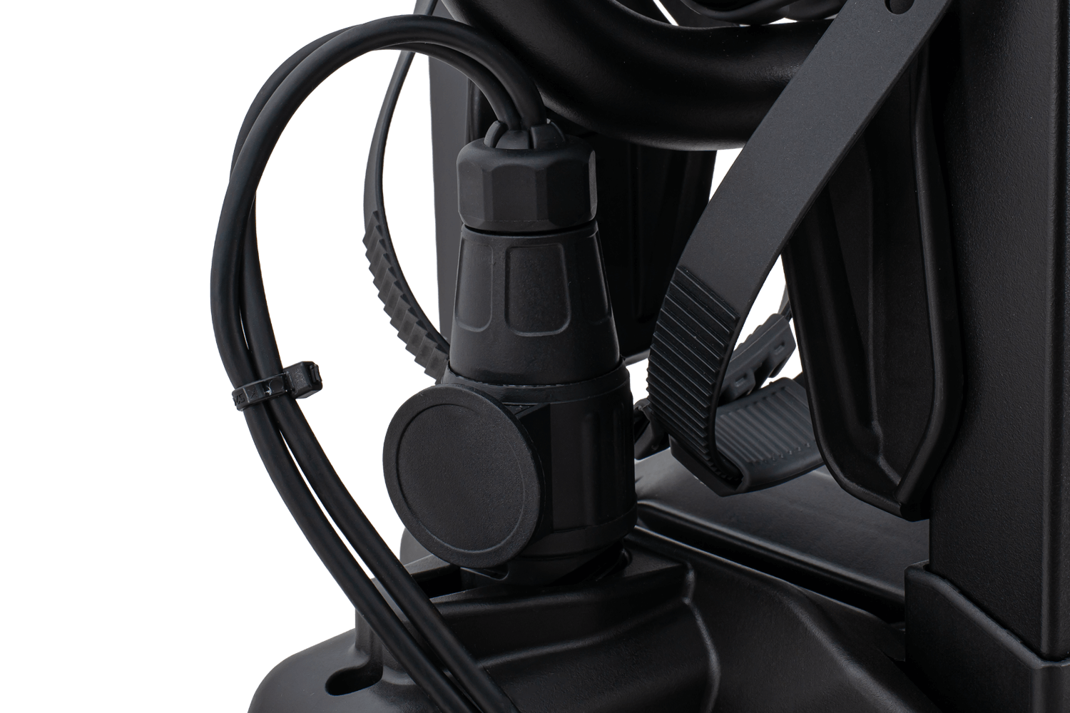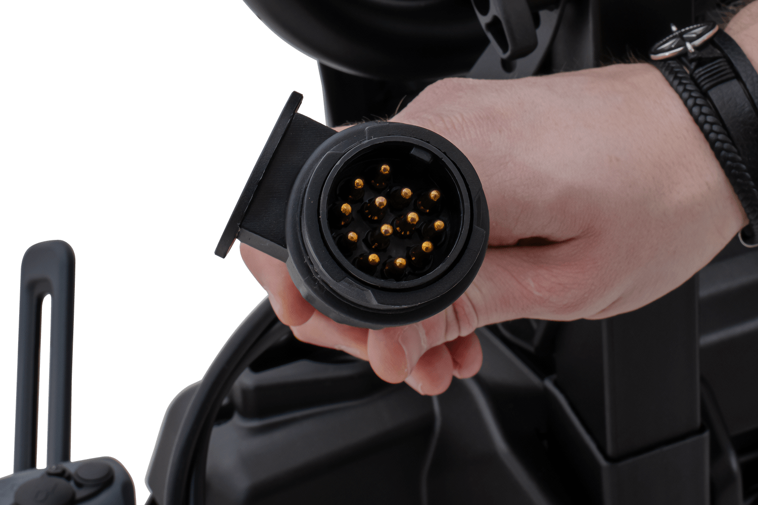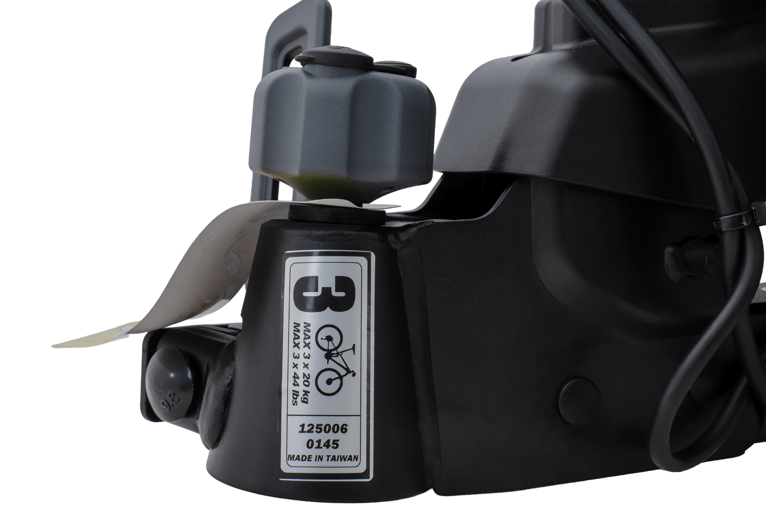 Die sichere Kupplung wird durch das konische System und einen speziellen Hebel gewährleistet, der den Mechanismus an der Anhängerkupplung verriegelt. Diese doppelte Sicherheit sorgt dafür, dass Ihre Fahrräder auch auf langen Fahrten stabil und sicher stehen.