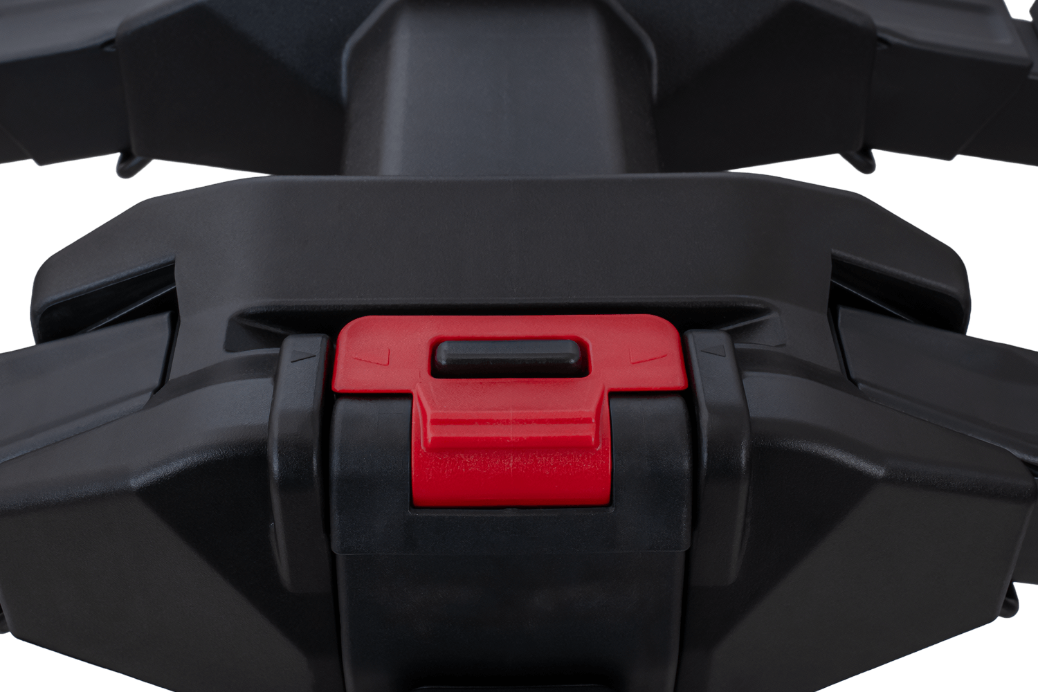 Ein Dreipunkt-Fahrradhalterungssystem sorgt für Stabilität beim Transport. Das System nutzt zwei Spanngurte – einen für jedes Rad – und einen Arm zur Stabilisierung des Fahrradrahmens. Die Kontaktpunkte sind durch eine Gummibeschichtung geschützt, die Rahmen und Räder vor Beschädigungen schützt. Jeder Arm ist mit einem Schlüsselschloss ausgestattet, um die Sicherheit Ihrer Ausrüstung beim Abstellen zu gewährleisten.