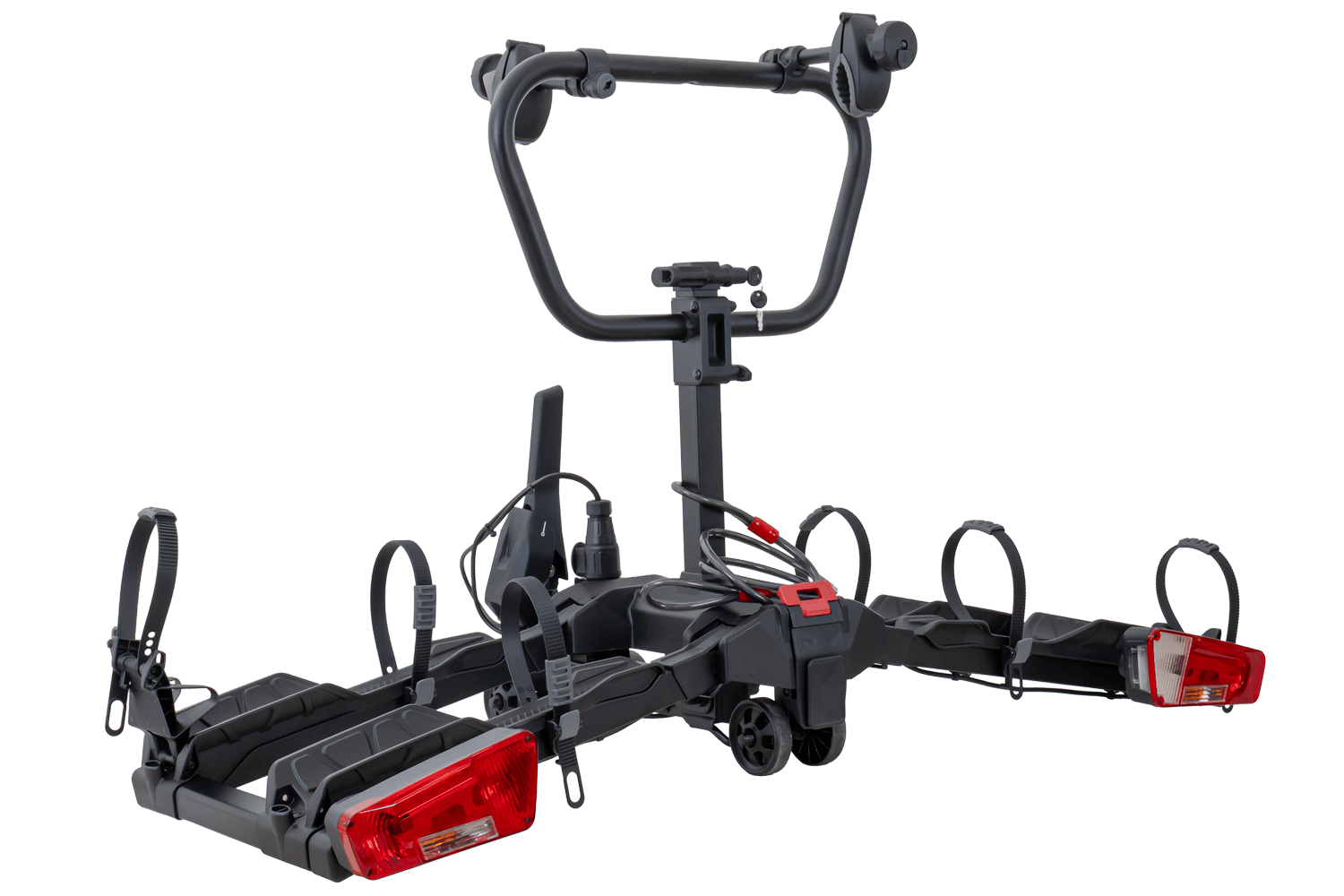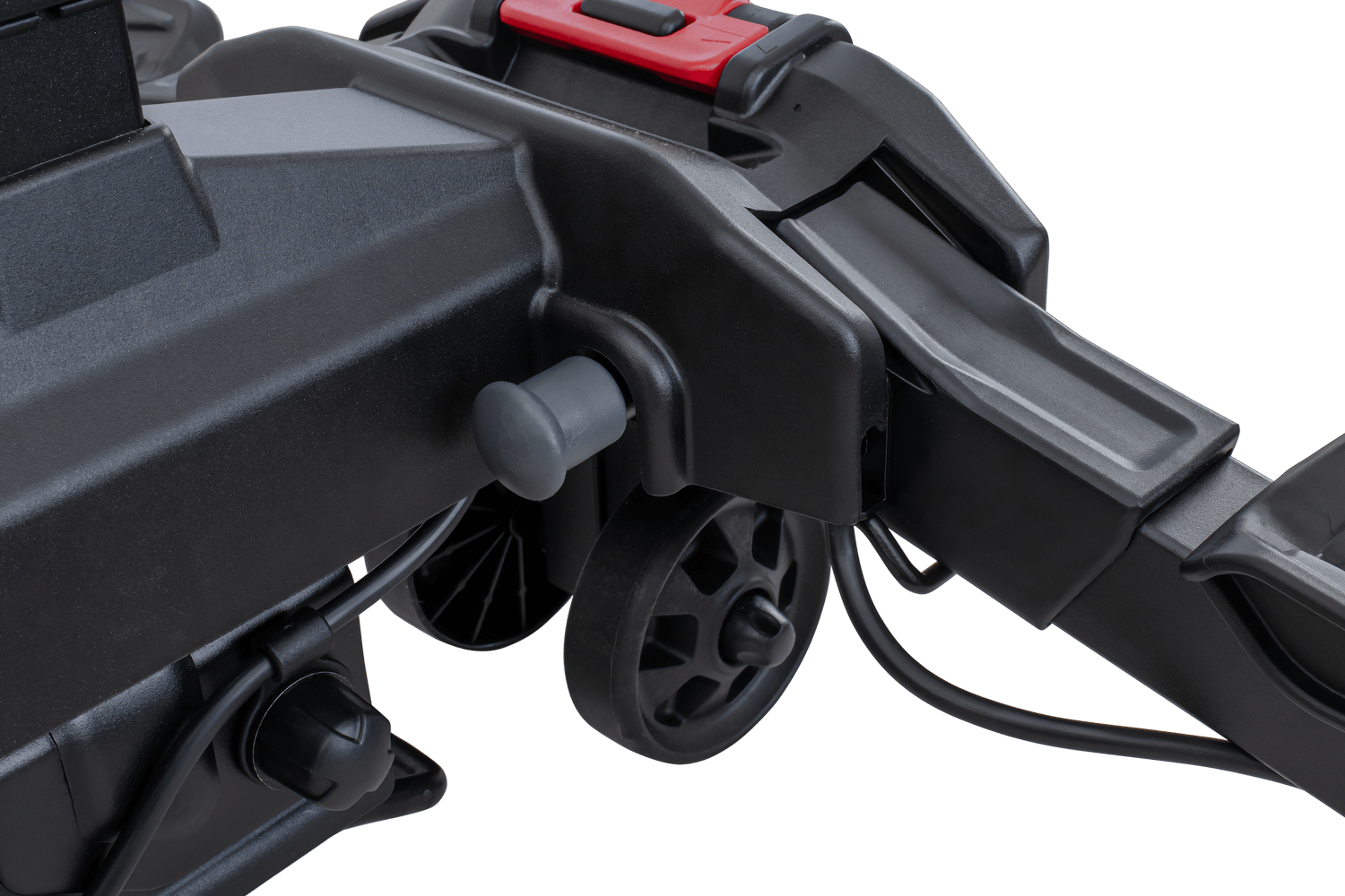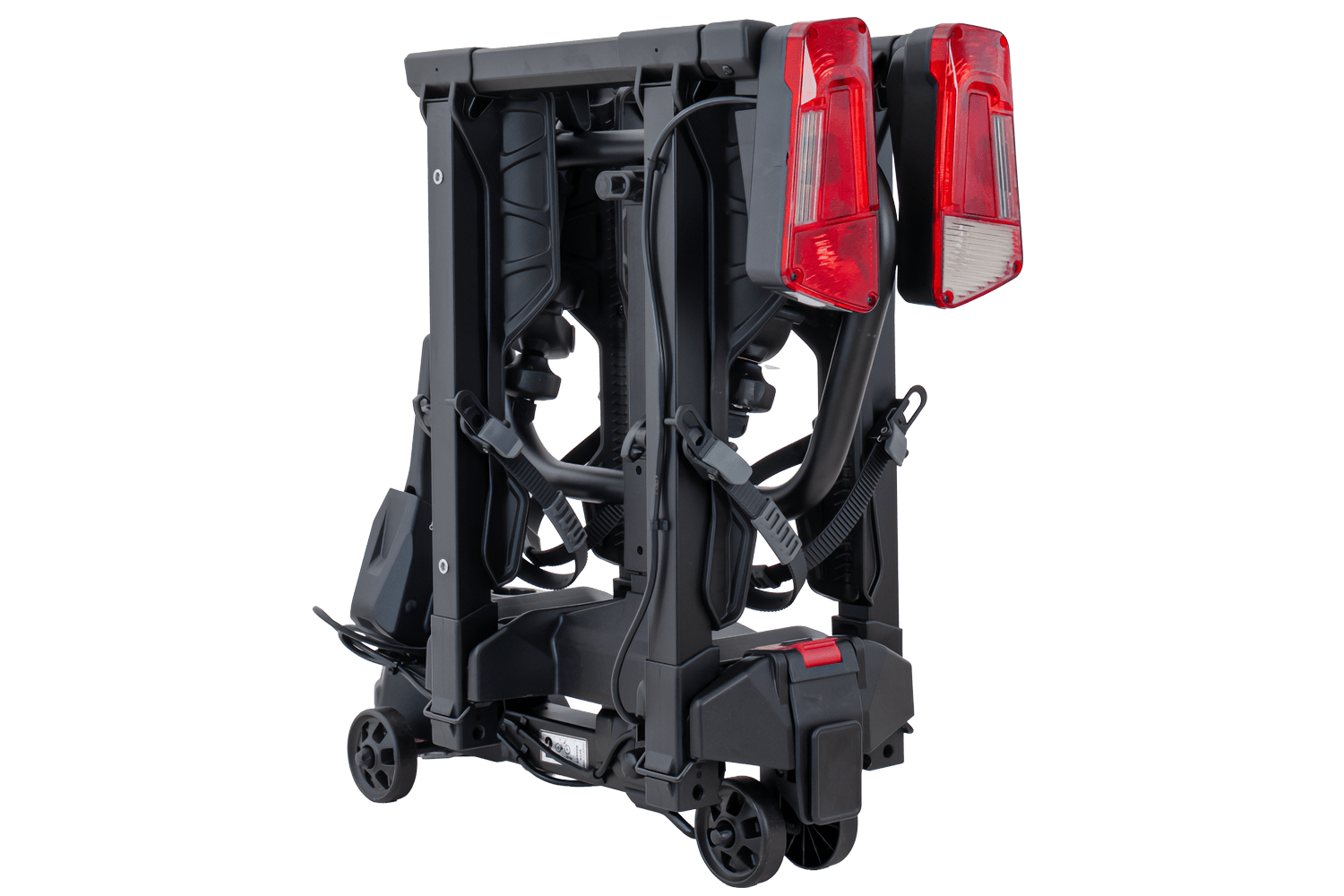 Zusätzliche Transporträder ermöglichen den einfachen Transport der Plattform, beispielsweise von der Garage zum Auto. Für eine schnelle Montage sorgt ein Hebelmechanismus , der eine schnelle und sichere Befestigung der Plattform an der Anhängerkupplung ermöglicht – ganz ohne Werkzeug. Das Fahrradmontagesystem ist sicher, stabil und rahmenschonend. Die gesamte Einheit besticht durch ihr modernes Design und ihre durchdachte Konstruktion, die selbst die Erwartungen anspruchsvollster E-Bike- Nutzer erfüllt.