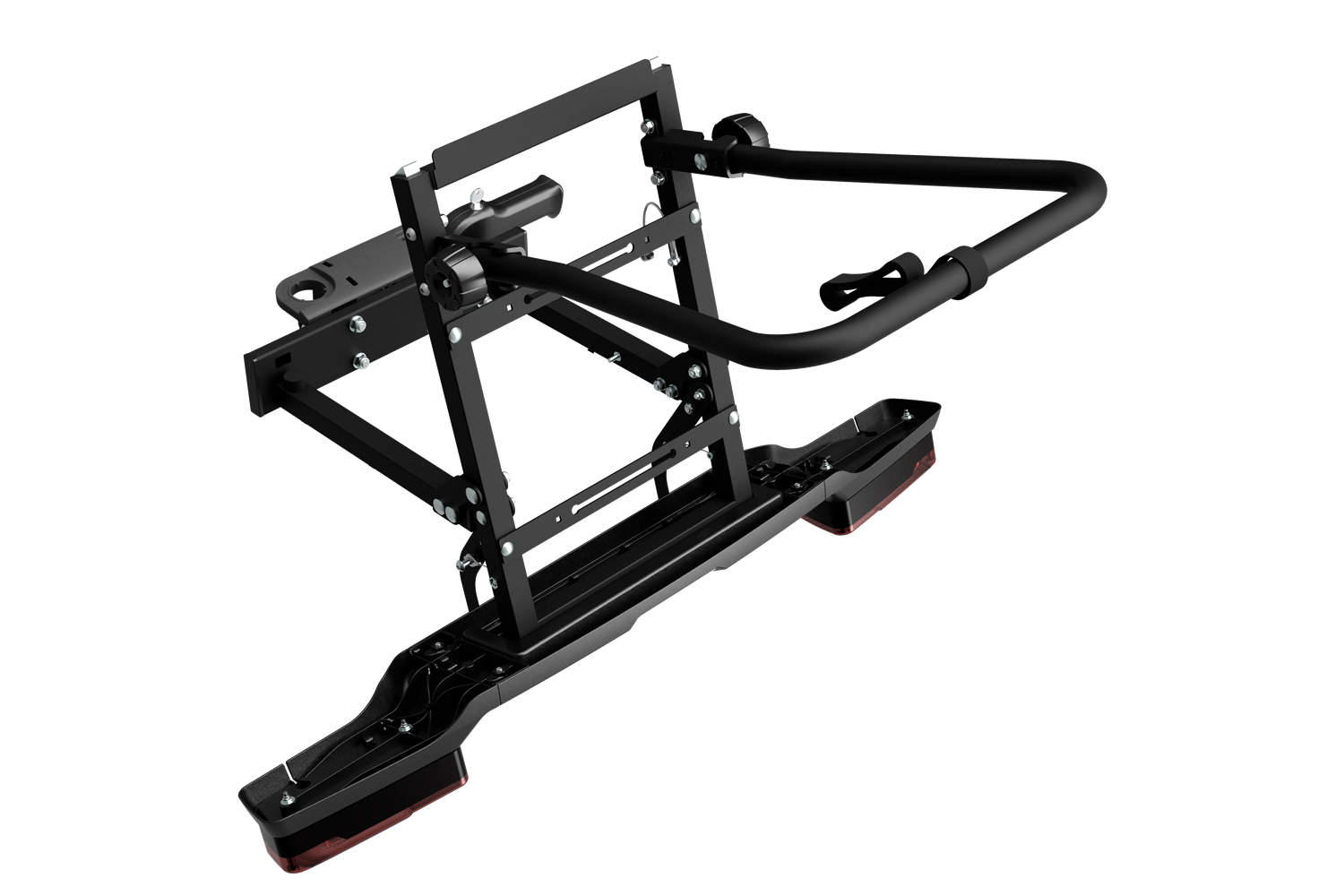 Die aus langlebigen Materialien gefertigte Tragstruktur trägt eine Tragkraft von bis zu 60 kg und ermöglicht so den problemlosen Transport von normalem Gepäck oder sogar schweren E-Bikes. Die Basis wird an der Anhängerkupplung des Fahrzeugs montiert und ist mit einem zertifizierten Beleuchtungssystem und einem Nummernschild ausgestattet, das den europäischen Straßenverkehrsnormen entspricht. Dies gewährleistet volle Sichtbarkeit und Sicherheit während der Fahrt .