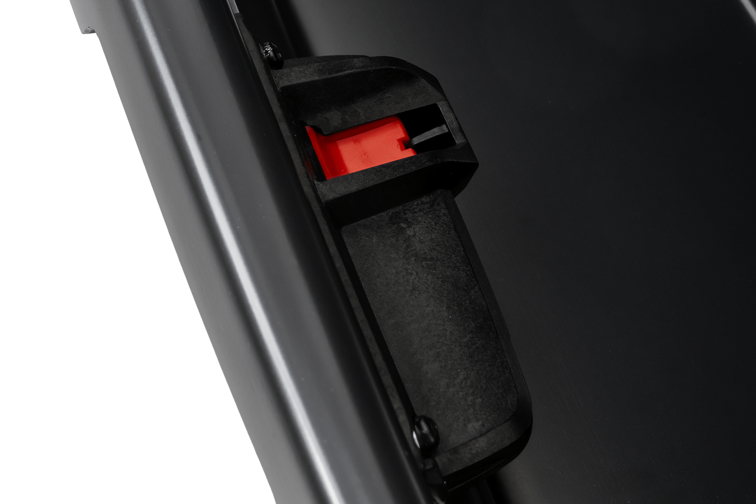 Die beweglichen Montageschienen passen in Abstände von 46 cm bis 115 cm und der eingebaute Dynamometer schützt vor zu starkem Anziehen und sichert sowohl das Rack als auch die Box.