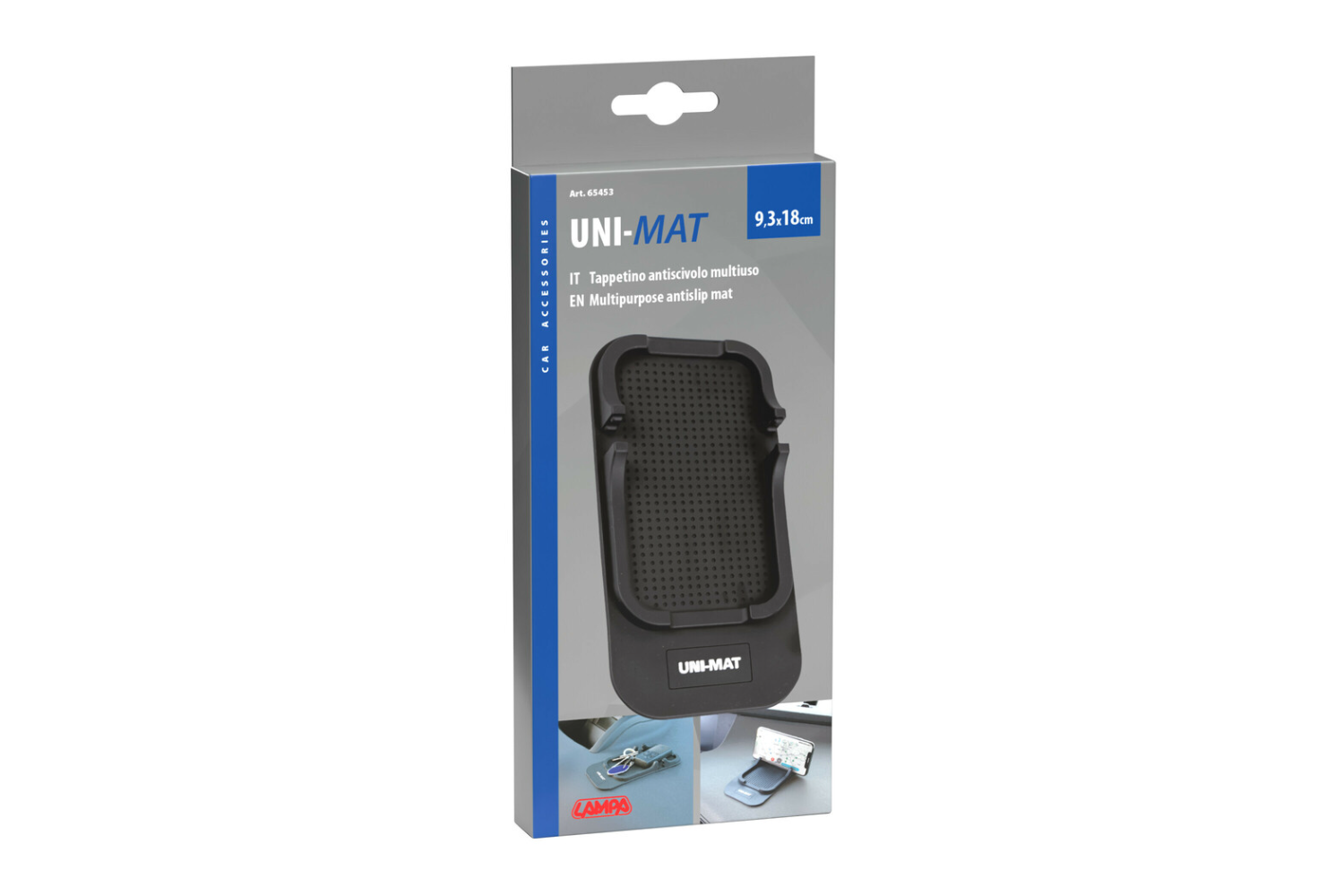 Die multifunktionale Antirutschmatte Uni-Mat von LAMPA (185 x 95 mm) ist eine praktische Unterlage für Auto, Zuhause oder Büro. Sie ermöglicht die sichere Ablage kleiner Gegenstände wie Handy, Münzen, Schlüssel oder Fernbedienung für das Tor auf dem Armaturenbrett oder der Arbeitsfläche. Dank ihrer rutschfesten Oberfläche bleiben die Gegenstände auch beim Bremsen, in Kurven oder auf unebenem Untergrund an Ort und Stelle. So werden Ablenkungen des Fahrers und Geräusche im Innenraum reduziert. Die integrierten Rillen dienen gleichzeitig als praktischer Handyhalter , sodass Navigations- oder Benachrichtigungs-Apps schnell im Blick behalten werden können.