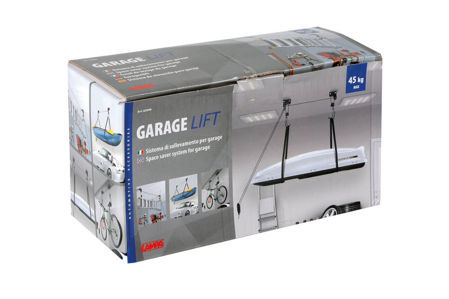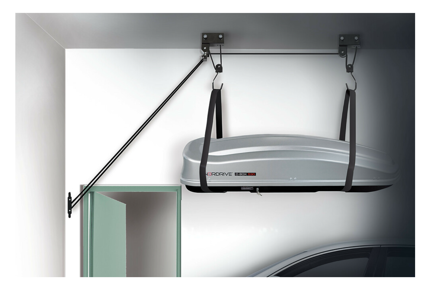 • Der Garagenlift ist ein deckenmontiertes Aufbewahrungssystem, das Ihnen hilft, Ihren Garagenraum optimal zu organisieren. Er bietet Platz für Dachboxen, Fahrräder und Leitern mit einem Gewicht von bis zu 45 kg. Ein Montagesatz für die einfache Installatio