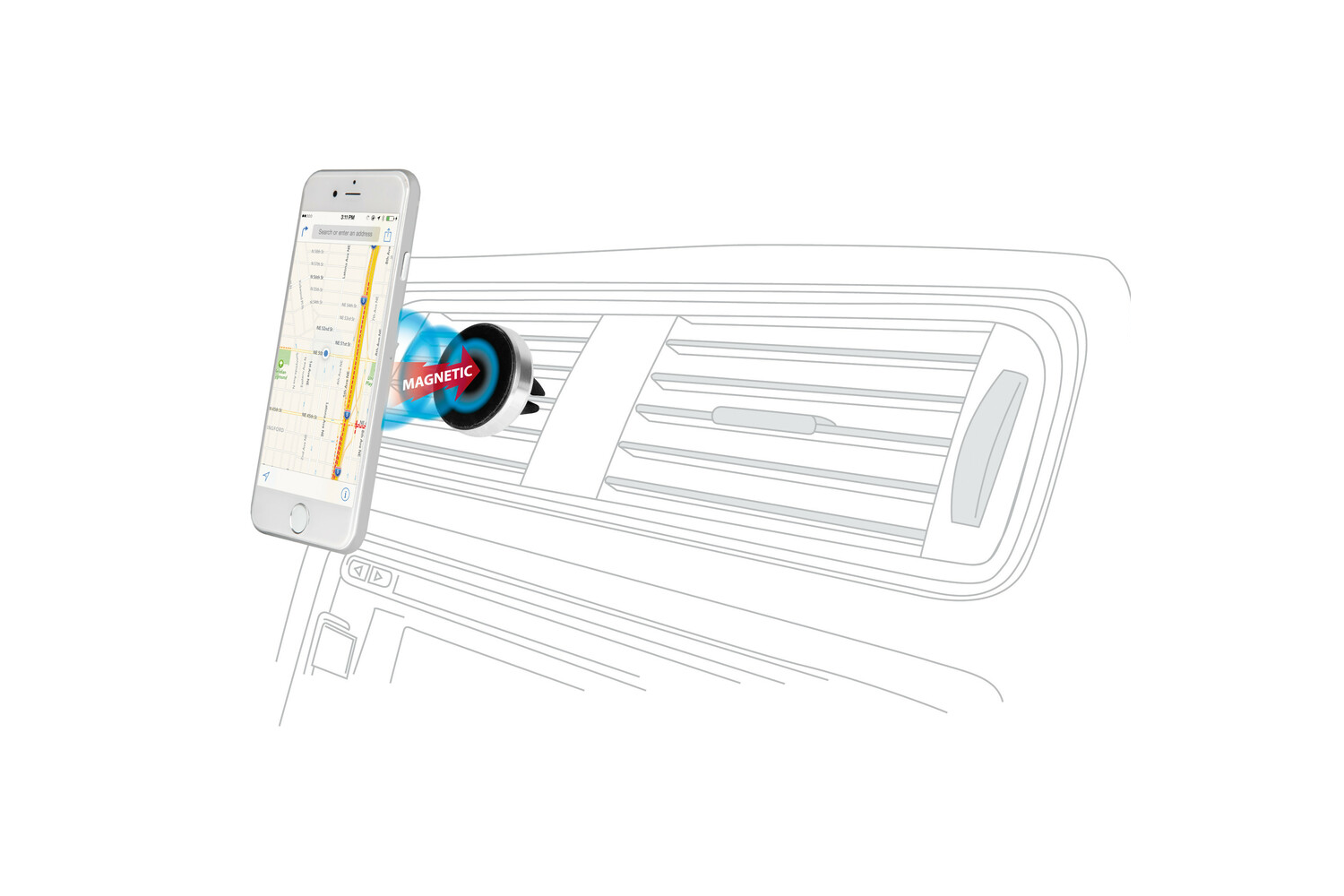 Magneto ist eine kompakte Magnethalterung zur Befestigung am Lüftungsschlitz im Auto, mit der Sie Ihr Smartphone schnell und bequem anbringen können. Das robuste Aluminiumgehäuse mit gummierter Oberfläche schützt das Gerät vor Kratzern und sorgt für sicheren Halt während der Fahrt.