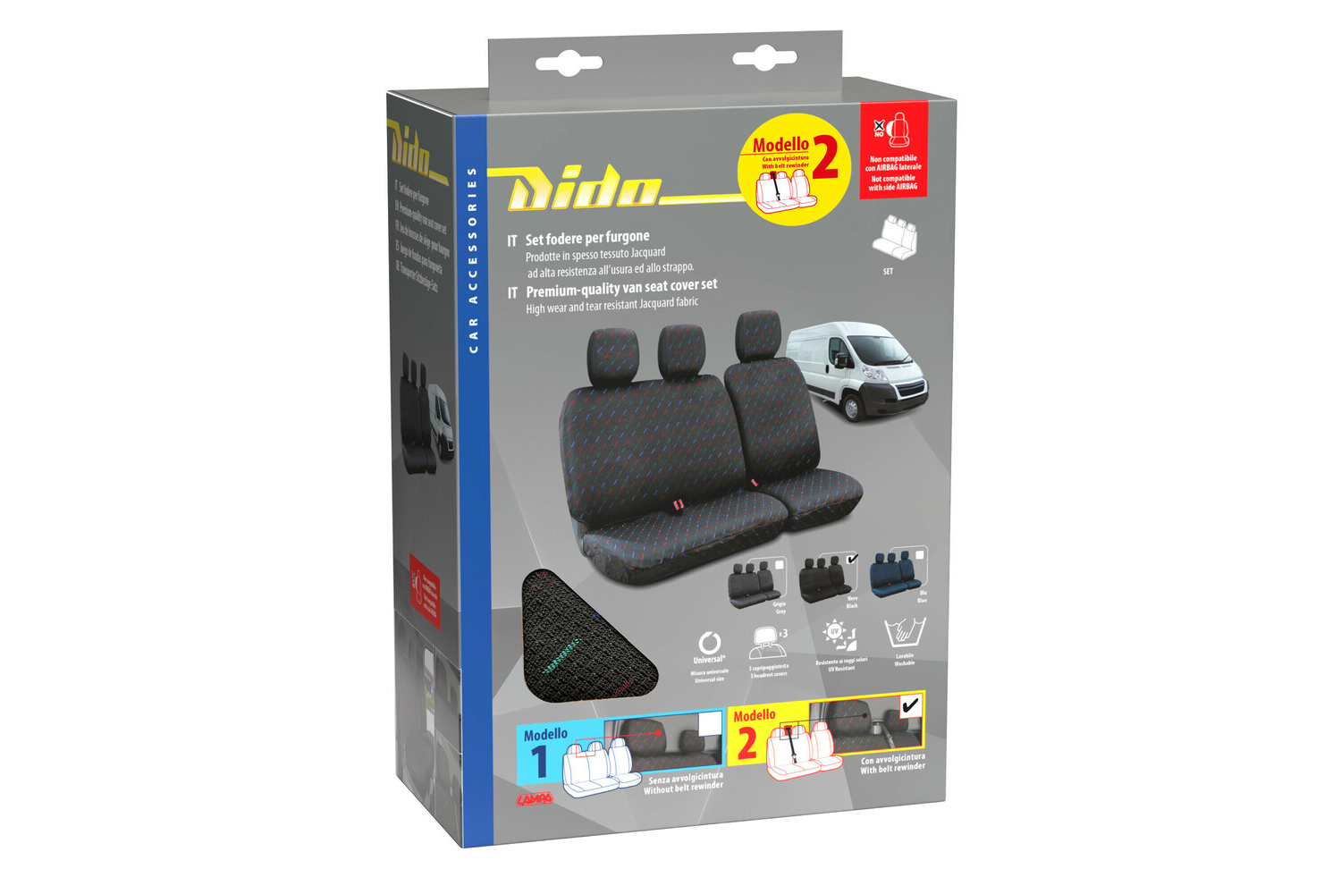 • Die schwarzen Dido-2-Sitzbezüge für Transporter sind aus strapazierfähigem Jacquard-Gewebe gefertigt. Dank ihrer universellen Passform passen sie auf viele Modelle, auch solche mit Gurtstraffern. Kopfstützenbezüge sind im Lieferumfang enthalten. Sie schüt
